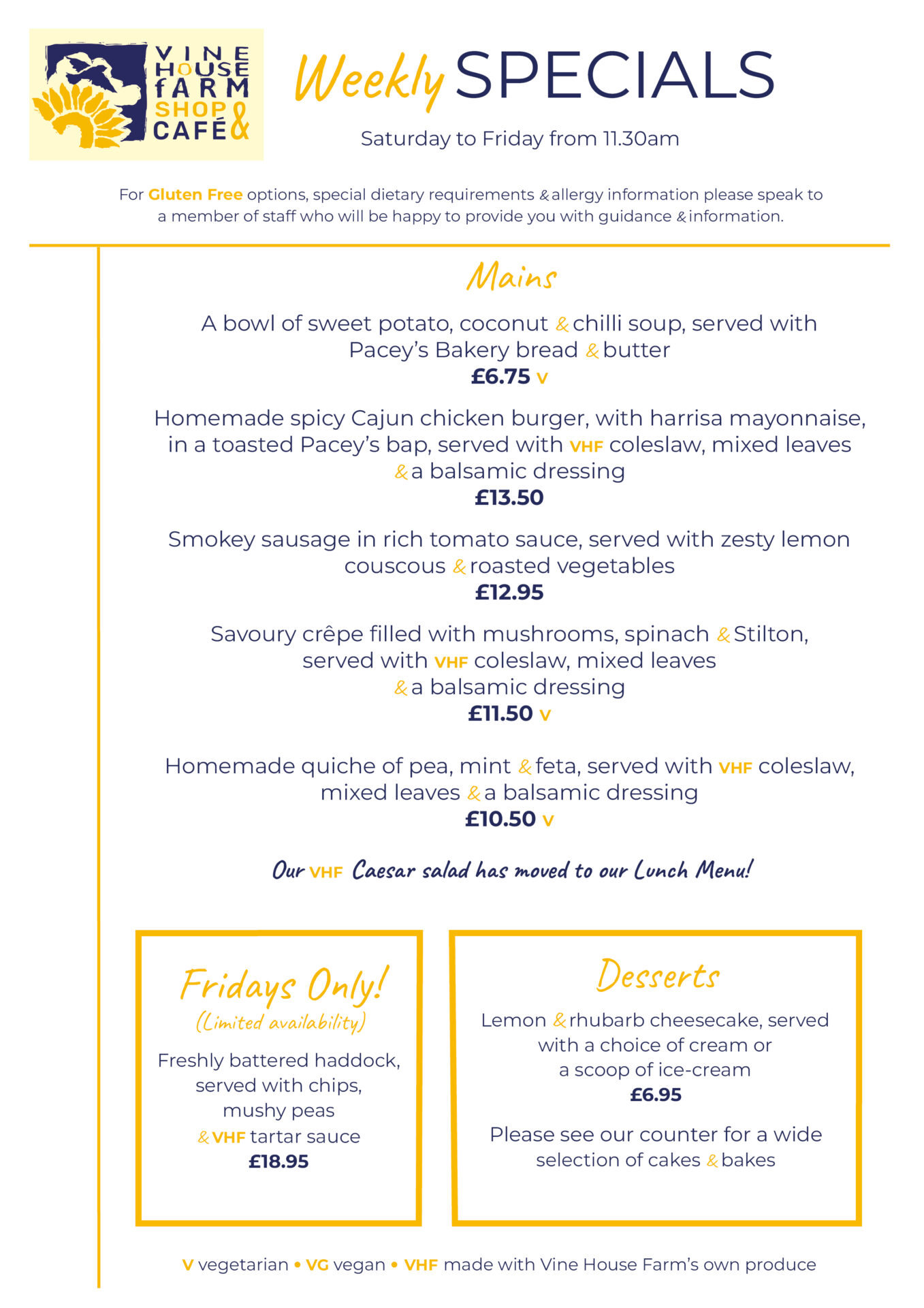 Our weekly Specials Menu is based on what is available in the current season. We’ll be offering choices such as quiches, frittatas, burgers, salads & savoury pancakes.